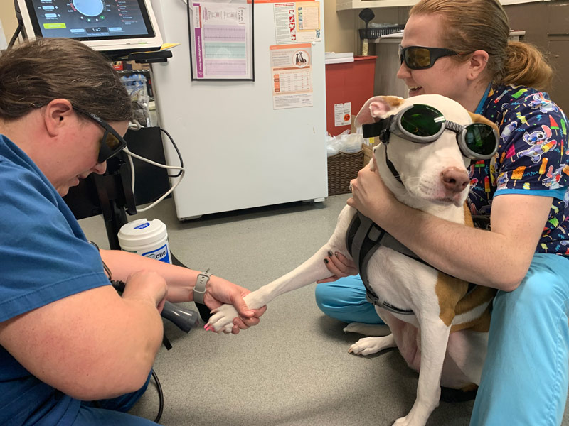 We are proud to announce we are now offering laser therapy, an innovative new way to treat pain and inflammation in pets. Laser therapy uses specific wavelengths of light to create therapeutic effects such as improved healing time, pain reduction, increased circulation and decreased swelling. Multiple studies have shown laser therapy can help with a variety of problems including arthritis, joint pain, ligament sprains, muscle strains, dog/cat bites, feline acne/asthma, hotspots, post trauma/surgery pain, hip dysplasia, lick granulomas and snake/bug bites.